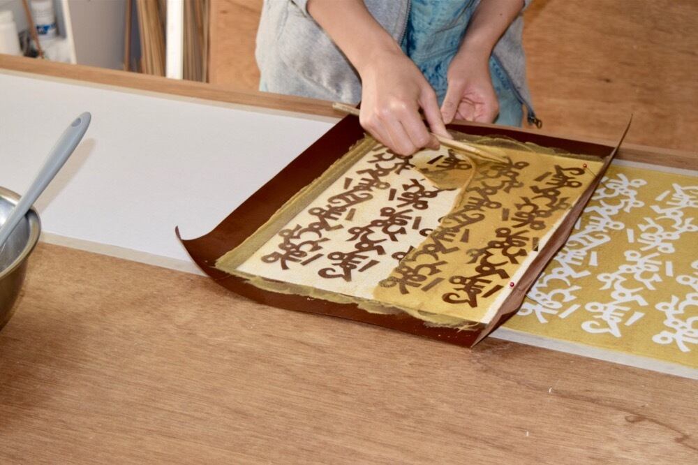 伝統的な型染めという技法で一枚一枚、一筆一筆丁寧に染め上げた布は、